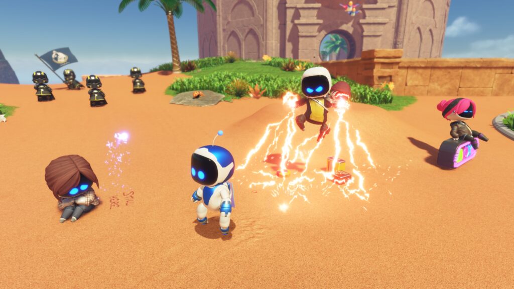 El estilo artístico es cartoon pulido, muy colorido y estilizado. Me recuerda a Pixar por su carisma visual. Los diseños de enemigos y jefes podrían parecer simples, pero cumplen su función, ya que el juego se centra más en el diseño de niveles que en los personajes. Aun así, los bots que representan personajes icónicos de PlayStation son muy creativos y chistosos. Hacen que quieras rescatarlos a todos solo para ver qué animación tienen o cómo están caracterizados.