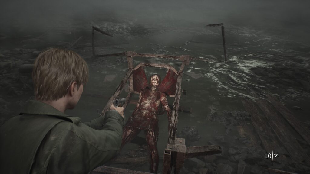 El combate tiene un problema serio: la variedad de enemigos, la cantidad y lo repetitivo que se vuelve en poco tiempo. Silent Hill 2 cuenta con 5 tipos de enemigos, de los cuales 2 salen hasta el cansancio. Llega un punto donde pelear con ellos se siente como perder el tiempo. Me refiero a los mannequins, que son un recurso para asustar efectivamente, pero tras avanzar, en vez de lograrlo, terminan molestando porque se vuelven hasta predecibles. A veces hay juegos que implementan loot por cada enemigo vencido y así se siente valioso eliminarlos. Aquí no: la munición solo se puede adquirir explorando cada rincón del mapa. Esto lo hace más realista, pero vamos a ser serios: Silent Hill no es realista, no juega con las mismas reglas de la vida real, y eso está claro. Hay enemigos que están escondidos y salen mucho; ya después de unas horas se vuelve tedioso luchar contra ellos y lo mejor es pasar de largo.